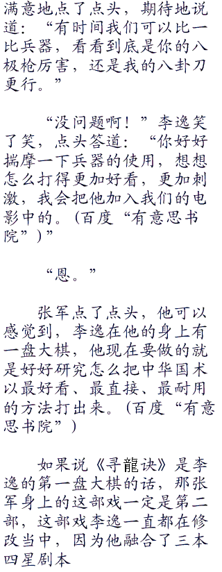 在飞机上,张军想李逸问道:“你是怎么学会八极拳的?还融入了八极大枪?”