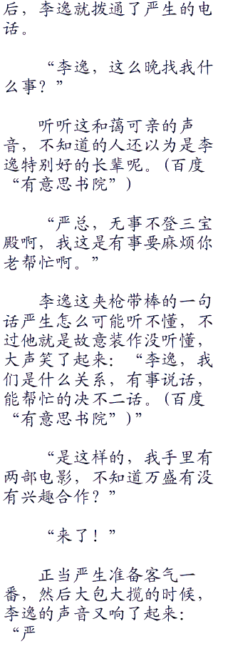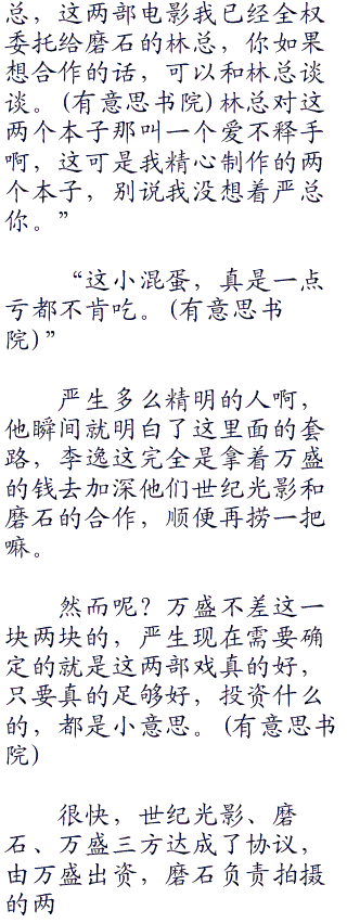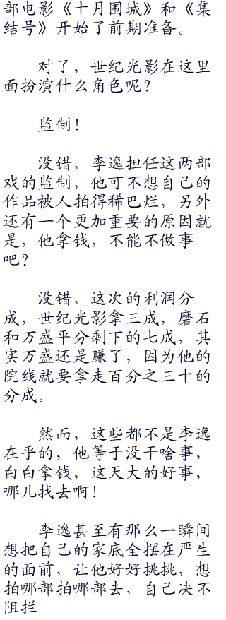 “有这部分原因。”李逸继续说道:“这两部戏,我一定会用大卡司,大阵容,无论是背景布置还是演员阵容,我这次非要让万盛好好出出血不可。”