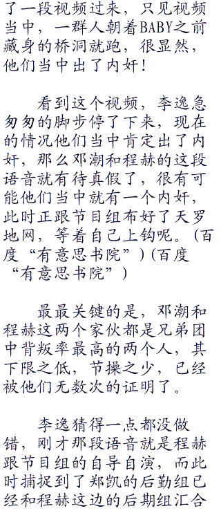 baby听到李逸的话后瞬间明白了,李逸是怀疑他们当中某些人被节目组策反了,如果baby出现没一会儿就有节目组的人员过来,那就可以百分百确定了。