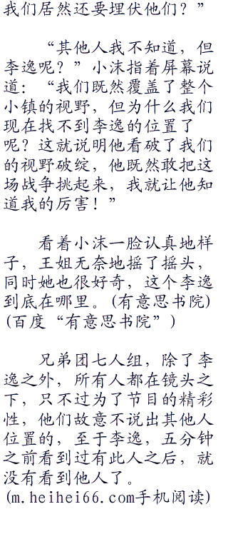 这是baby的声音,李逸听到她的声音之后,答道:“我们先集合一下,大家报一下自己的位置,我去找你们!”