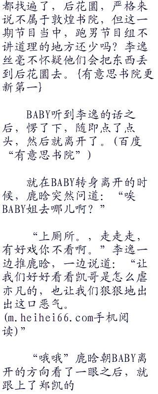 吴亦凡出乎意料之外的点了点头,然后就向一楼走去,郑凯想了想,不管情况如何,这绝对不能怂啊,于是也朝一楼走了去,鹿晗紧跟了上去,就在baby也准备跟上去的时候,李逸突然拉住了她,说道:“你去找姓名条去,多看看我们刚才没有去过的地方,还有后花圜,他们有可能把姓名条丢在哪里了。”