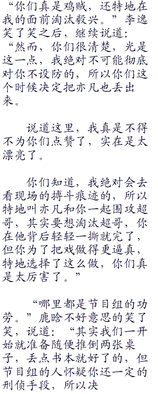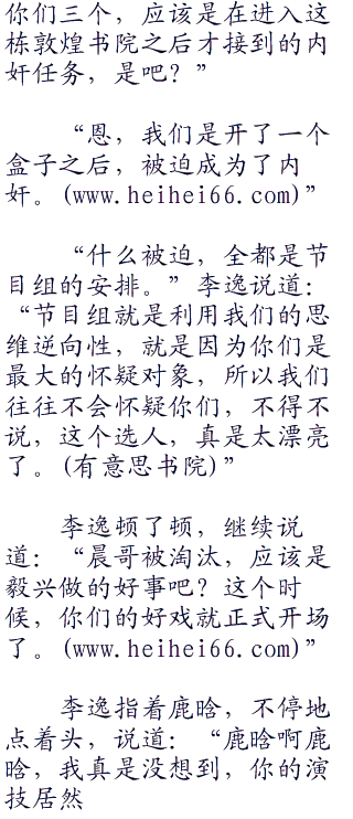 鹿晗和吴亦凡听见李逸的声音之后,转过头来,看着他,问道:“李逸,你是怎么知道我们两个是内奸的?你刚才拉住我,明显是知道了,你是什么时候知道的?我应该没有露出破绽啊。”