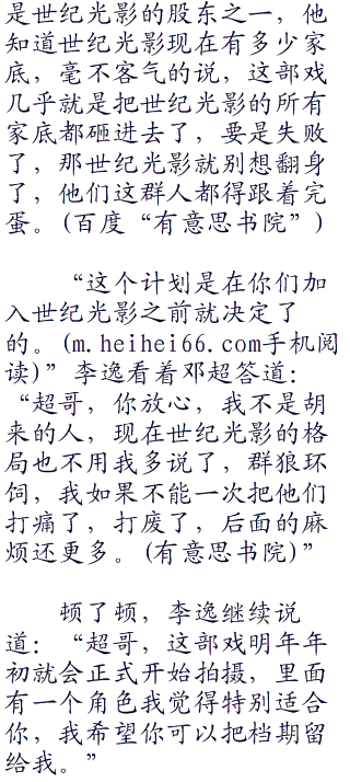 “电影。”李逸想了想,干脆地答道:“这部戏是世纪光影和环球联合制作的,我们一起投资三亿美金,我自编自导自演!”