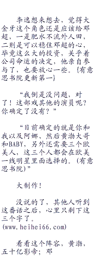 听到baby这么说,在场所有人的目光都向李逸忘了过来,要说以前的李逸还只是一个一流演员,三流导演,那经过《匹诺曹》一役之后,他已经成为了新生代里大有前途的导演,他的新戏自然是备受关注了。