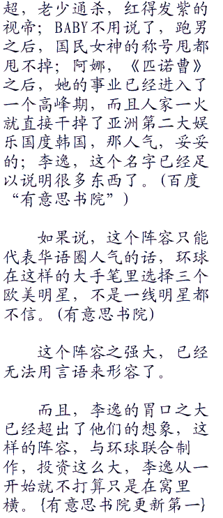 联合制作就算了,李逸和环球的关系已经不是什么秘密了,这还在大家的接受范围之内,但三亿美金的制作成本,这就让人相当不能接受了。