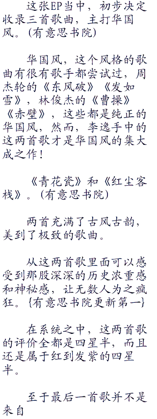 说实话,李逸也不知道为什么,或许只是因为喜欢吧,喜欢唱歌的感觉,更加希望广大的民众可以喜欢自己手中的歌曲,于是决定发布这张ep。