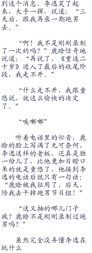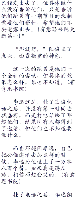 “三天后不是要录制跑男嘛。”陆俊说道:“这次跑男嘉宾采取的模式是邀请,你们自己去邀请一个嘉宾,男女无限。.com”