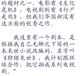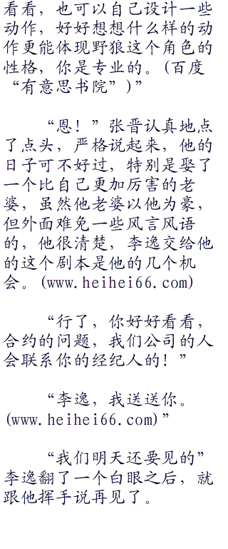 “那就好。”李逸点了点头,从随身包包里拿出了一份剧本,说道:“里面的野狼就是你饰演的角色,拿回去好好看看,这里面还有我设计的一些武打动作,你可以