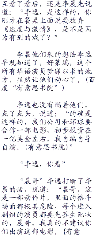 “不用了,我也不跟你拐弯抹角。”李逸顿了顿,说道:“记不记得我在餐桌上面曾经说过,我很有可能要放弃《速度与激情》,你知道为什么吗?”
