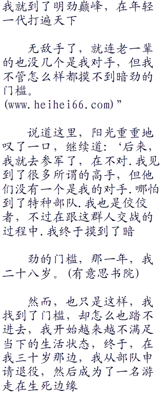我的两个哥哥都不喜欢练武,他们努力读书,一个当了医生,一个当了律师,很高尚的职业,但我不喜欢读书,只喜欢练武,我喜欢那种和天下各路高手交手的感觉,二十岁,