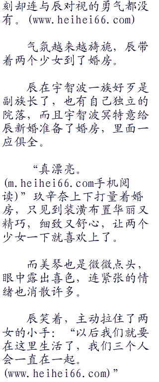 而玖辛奈和美琴也都仿佛察觉到了辰的想法,连耳根都是一片红色,羞涩之极,连一向大胆的玖辛奈都不敢看辰,美琴就更不用说了。