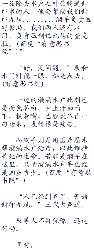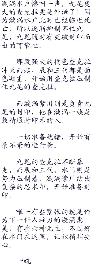 九尾人柱力的更换和封印可是一件大事,稍有不慎就会让木叶陷入危机,所以才这样严谨。暗部中以白牙为首,三十多名暗部将漩涡一族族地围住,以免外人入内。