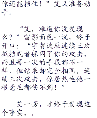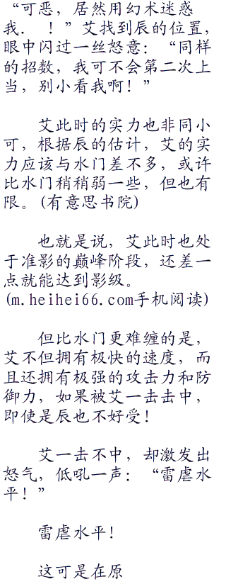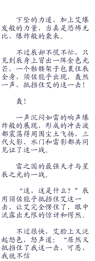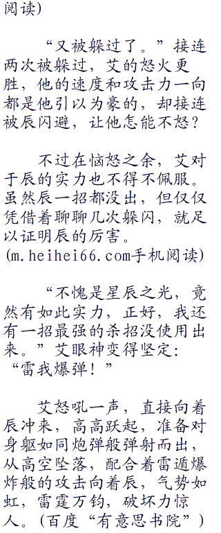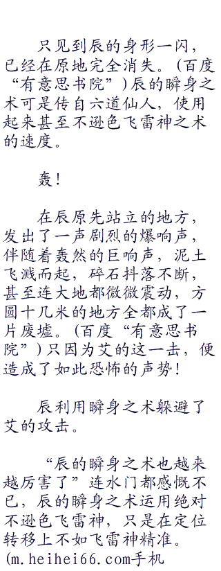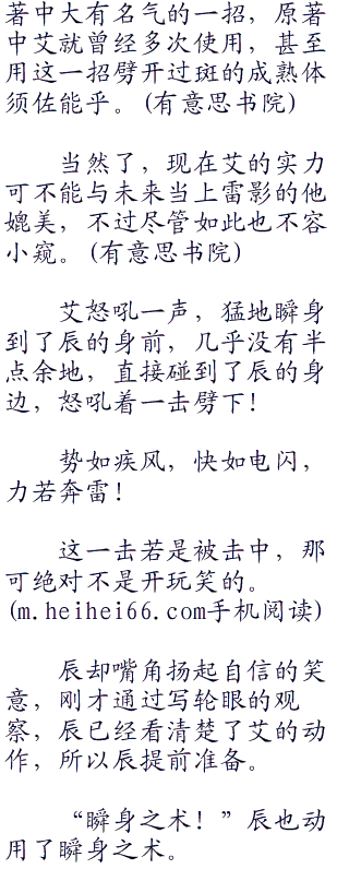 艾的这一击几乎带着山岳之势,用力劈来,直接劈向辰的身体!由于动作太快,辰几乎无法躲避,就被艾这一击击中。