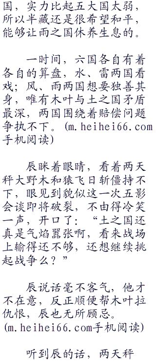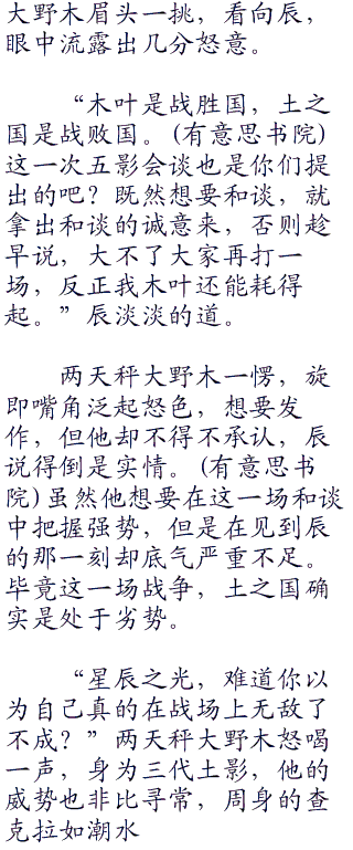 辰等人重新进入会议厅,却见到会议厅之内仍然是吵闹不断,以半藏、风影、土影和猿飞日斩争吵成一团,这四国的首领为了利益纠纷不断的争吵,反倒是水影和雷影显得非常淡定。