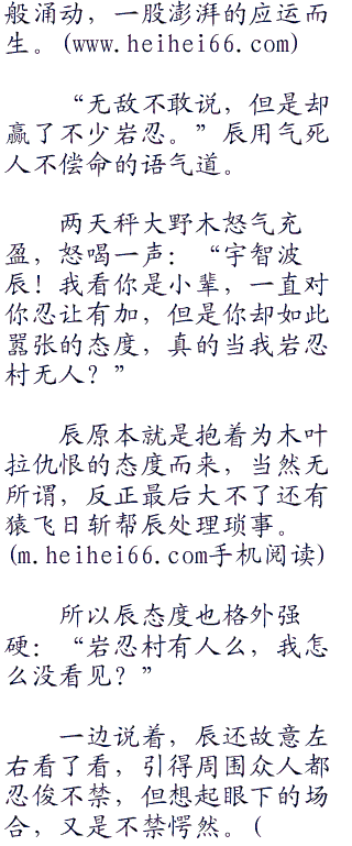 看到艾失魂落魄的样子,连水门都是笑容不止,平时水门和辰在一起时也总是吃瘪,而艾这家伙现在貌似还更惨,这让水门心里平衡不少。