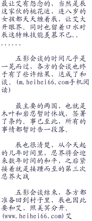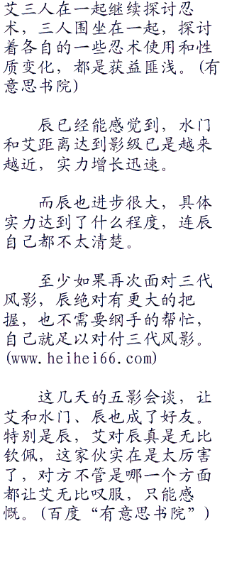 果然,片刻后猿飞日斩和水门便来到辰的房间,让辰一起去参加五影会谈。这一次的五影会谈,只怕还要持续两三天的时间。
