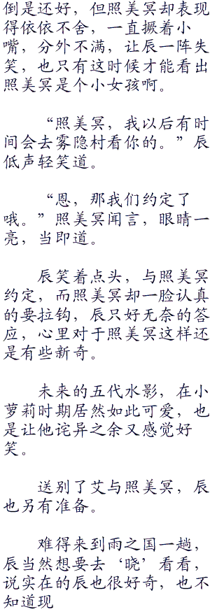 辰点头表示理解,大蛇丸确实是这样的性格,为人很是阴沉,心思很多,让人完全猜不透想法,所以才会“二八零”越来越偏激,最后走上叛忍的道路。