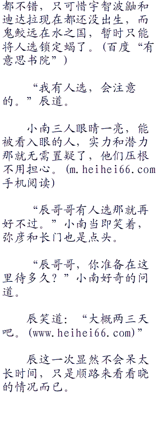 小南三人和角都都没想到辰会突然来到这晓的基地当中,小南三人当然是惊喜,特别是小南,眼睛都弯成了月牙儿。