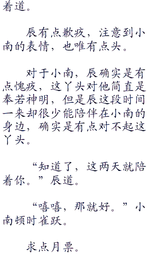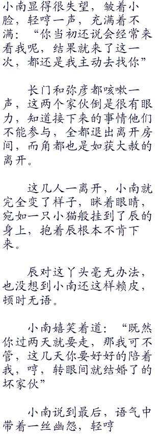 辰被小南三人请到了室内坐着,小南乖巧的站在辰的身后,为辰轻轻按摩着太阳穴,看着乖巧可爱,分外让辰心动。