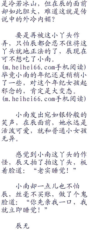 “别捉弄,乖乖睡觉!”辰猛地拍了小南臀儿一巴掌,让这丫头老实下来。没想到小南却咯咯一笑,反而一点儿也不怕,甚至舔了舔嘴角,带着一股别样的味道,双目相对,那一股清纯之中泛着几分娇媚的感觉令辰心里一荡。