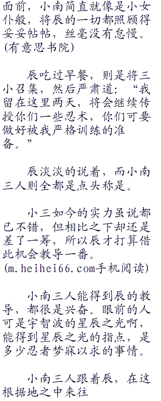 此时的小南已经有差不多近十二岁的年纪了,身子已经完全长开,辰能注意到在晓组织中,有不少忍者看着小南的目光中都带着倾慕。