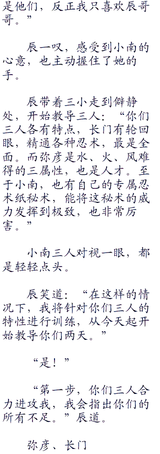 “辰哥哥”小南像一只小猫般一直在辰的身边来回的做着小动作,让辰也是一阵好笑,对这小丫头又是充满好感。