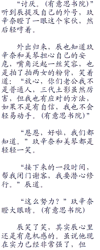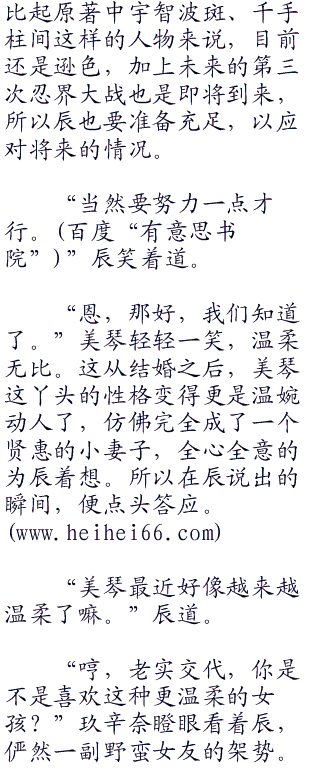美琴和玖辛奈见到辰归来,都是充满欣喜,嘴角泛起甜甜的笑容,美琴安静的看着辰,而活泼好动的玖辛奈却道:“我听三代大人说,你在这一次五影会谈上居然和三代土影动手了?”
