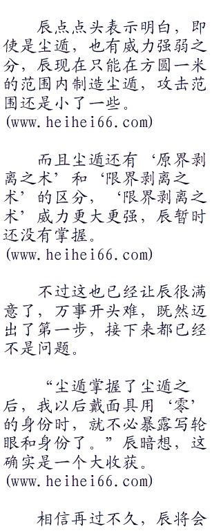 辰笑了笑,心情很好:“终于能使用出尘遁了,和我想象中花费的时间差不多,很难得。”