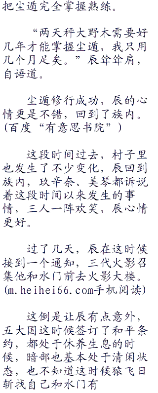 辰能将尘遁这么快就修行成功,无疑让六道仙人也很是惊喜。这种级别的忍术,即使是两天秤大野木也只怕花费了数年的钻研,而且还是在二代土影无的亲手指点下才能完成的,而辰却仅仅用了六七个月,就掌握了尘遁!