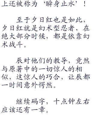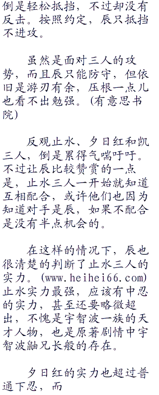 然而,虽然辰纹丝不动,但夕日红、凯和止水三人反而有一种被束缚的感觉,眼前的辰好像是破绽百出,仅仅是很普通的站在那里,但却无形之中给了止水三人一股极大的压力,甚至凯感觉到自己连脚步都险些迈不开了。