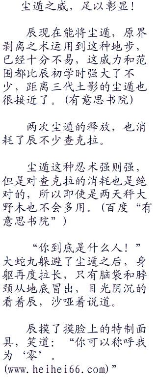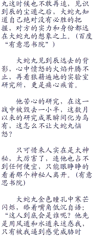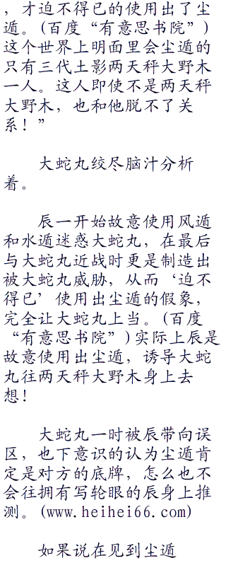 “血继淘汰,尘遁!”大蛇丸喃喃的念叨着这两个词语,面色更是紧张,看着辰的目光中充满了愕然。