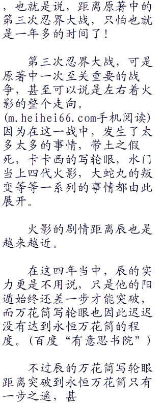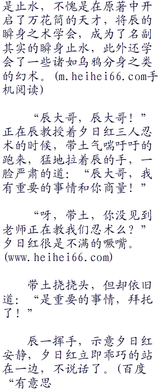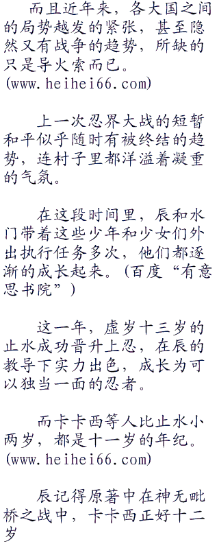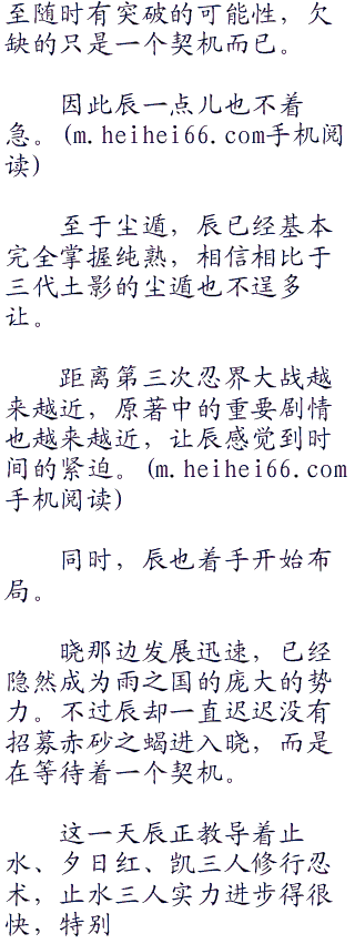 日子一天天的过去,水门与辰都开始教导着带土、止水、卡卡西、凯、夕日红等人的成长。在众人之中,最厉害的当然是止水,止水受到辰的教导,传自辰的瞬身之术和幻术,实力最强,年纪也最大。其次则是卡卡西,卡卡西天赋不错,或许是因为父亲是白牙的缘故,实力也一直很不错。