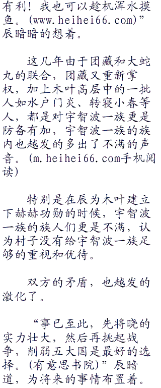 “目前的忍界又有战争的趋势,不过这也正好,忍界越是动荡战争,对我来说就越有利。五大国的力量越是削弱,对我以后就更容易。”辰暗道。