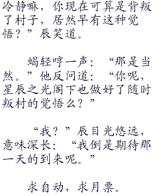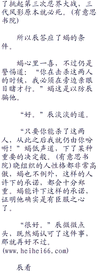 蝎没想到辰会这么快就答应他的条件,毕竟在蝎看来,自己的条件着实也有些苛刻了。