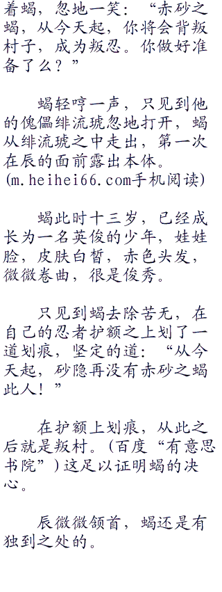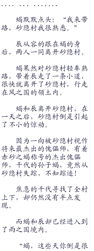 辰这才明白,怪不得蝎会在原著中杀了三代风影之后叛村,原来其中还有这样的缘故。