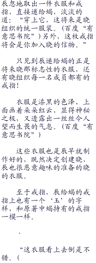 至于白牙,辰倒是没有必杀的理由,不过既然作为蝎加入晓的交换条件,倒是也可以考虑。