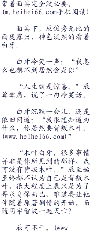 示意小南和蝎西安后退,留给辰与白牙谈话的空间,等到小南和蝎远去后,辰这才看向白牙,揭下了脸上的面具,事已至此,