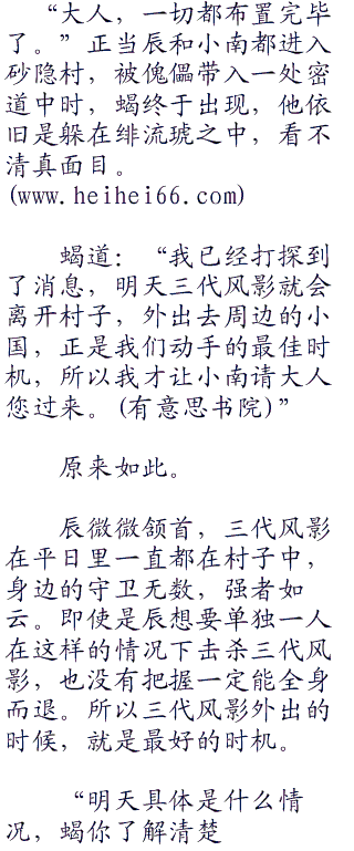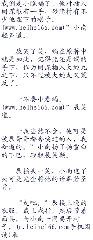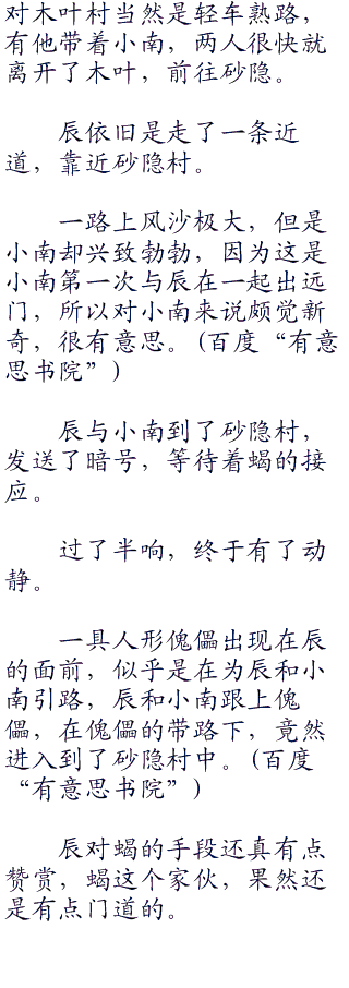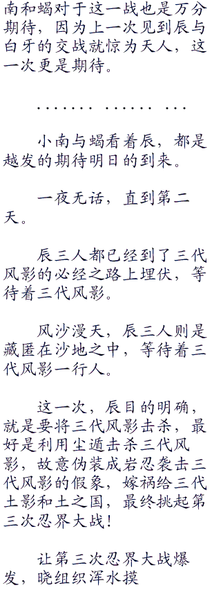 蝎已经被派去砂隐村,而小南则是负责联络辰,让辰在合适的时机内潜入砂隐村,击杀三代风影。