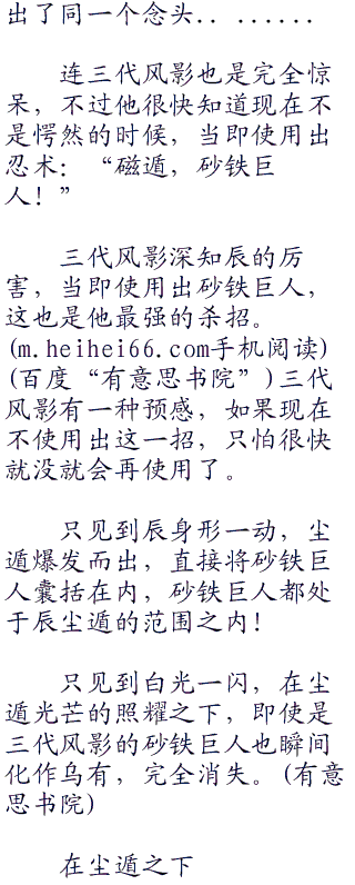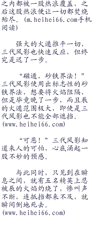 在这风沙的环境中,风遁和火遁最是吃香,所以辰一开始就用了自己拿手的火遁。