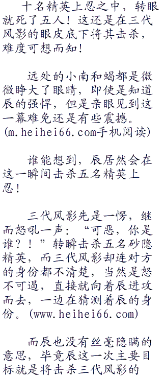 小南和蝎都是微微激动,特别是蝎,辰已经感觉到蝎仇视的态度,看来蝎对三代风影的恨意也不止一点半点。