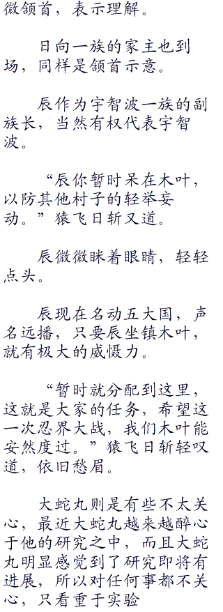 这时候的辰已经回到了木叶,也被猿飞日斩急吼吼的召集开会,辰、水门、团藏等高层都在列。