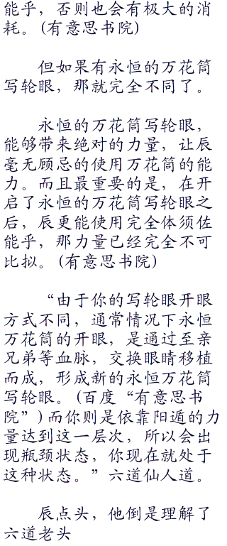由于辰的写轮眼并非是永恒的万花筒,只是普通的万花筒而已。所以辰现在依旧不能长时间的使用须佐