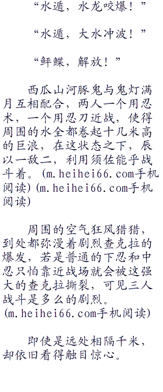 “哼,宇智波辰,在这样的环境下你处于绝对的劣势,虽然你有这个名为‘须佐能乎’的术,但是在水的环境之中,我身为鬼灯一族的人,可以在水中的任何一个地方使用瞬身之术,躲避你的攻击。”鬼灯满月冷哼道。