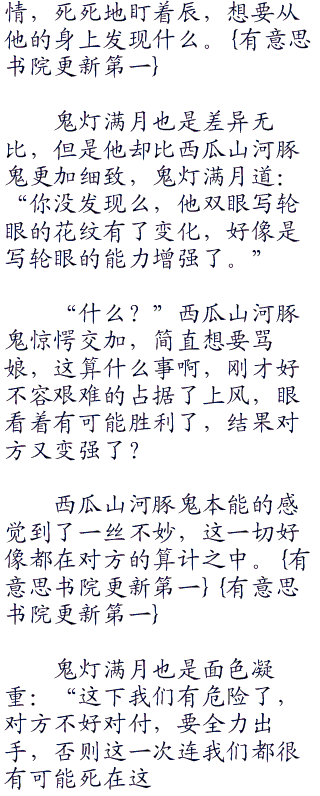 只见到辰的万花筒写轮眼发生了改变,变得更是神秘玄奥。有意思.书院首发之前那三瓣弯月的花纹,出现了丝丝转变,变成六瓣弯月的图案,同时周围还有丝丝圆圈,形成另外一个更加繁复的图案。