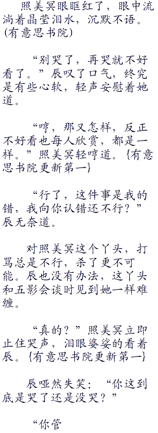 照美冥越说越是幽怨,幽幽的盯着辰。