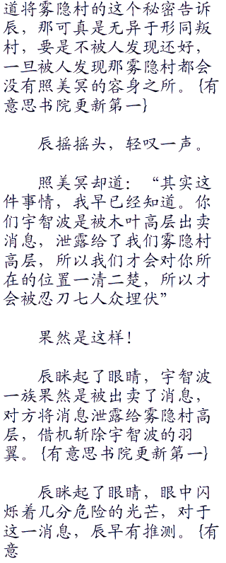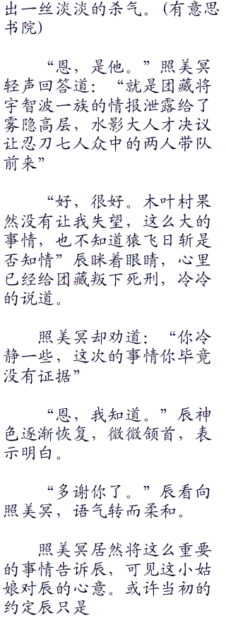 “这可是水之国的机密,如果我告诉你,就形同叛村了。”照美冥小声说道。
