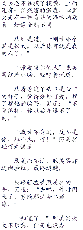 照美冥被辰握住手,顿时脸庞一红,扭扭捏捏的轻轻点头。