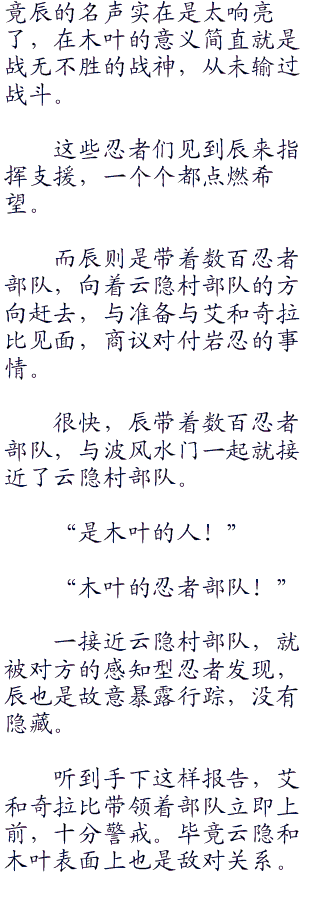 辰笑了笑:“当然,我一个人来如果没用,我估计木叶来再多人也不行。”
