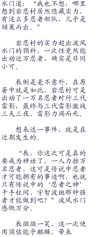 这可是近万名岩忍啊,但是辰却是说破就破,而且制造出了一个如此恐怖的雷遁忍术,让人终身难忘,实在是厉害。