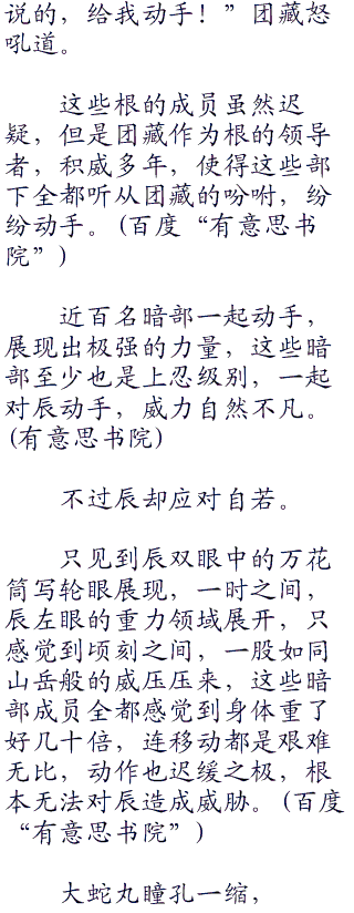 团藏一挥手,指挥着所有根的成员:“你们全都给我上,对付宇智波辰,务必要将宇智波辰带走!生死不论!”